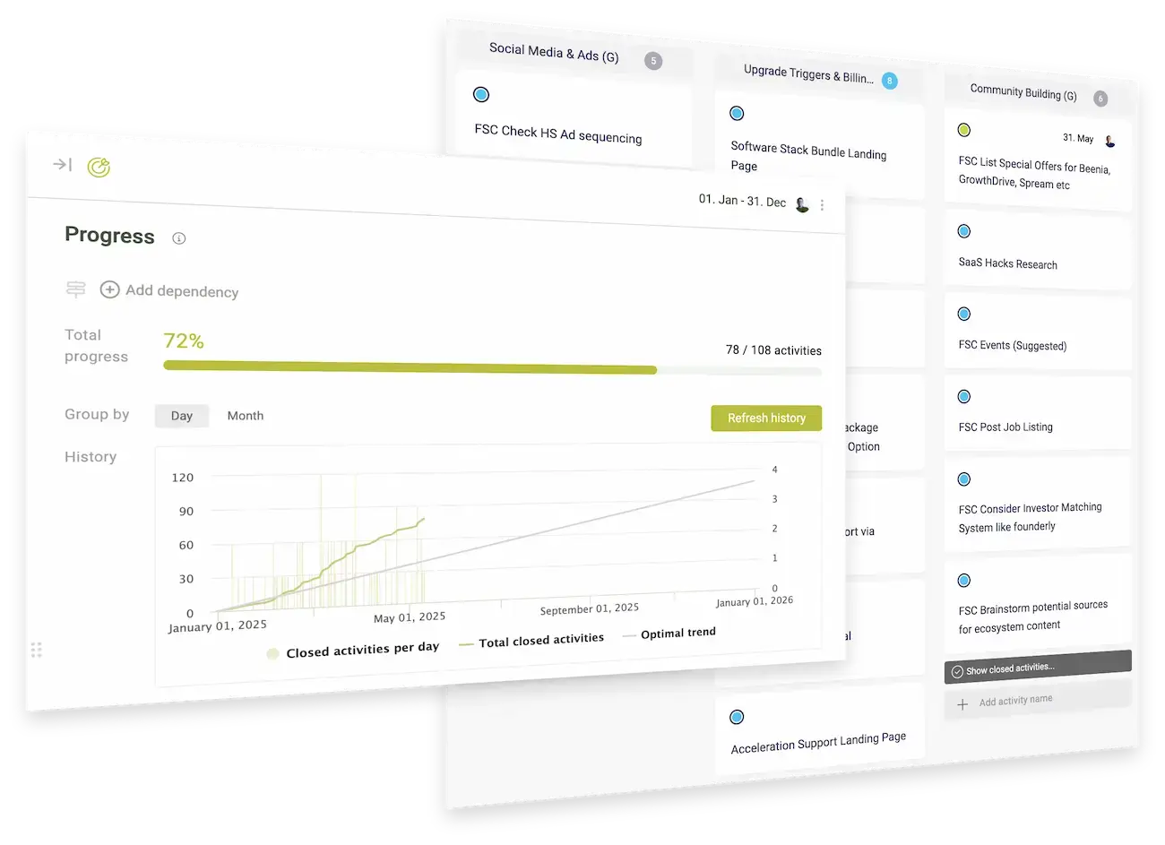 Sammeln Sie Wachstumsideen, verknüpfen Sie sie mit Zielen und verfolgen Sie den Zielfortschritt.